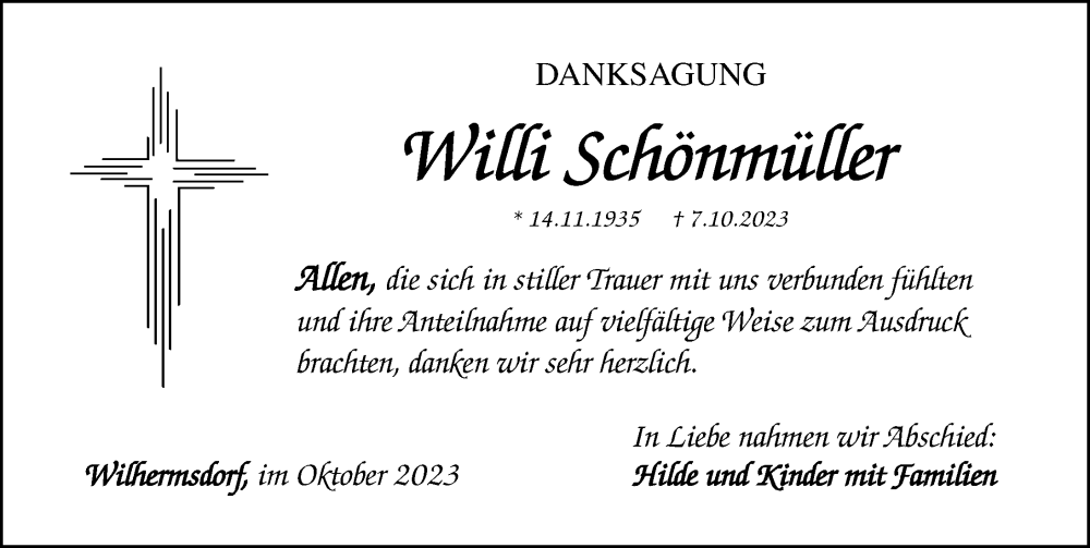 Hier finden Sie alle Traueranzeigen aus der Zeitung, die bisher für Willi Schönmüller erschienen sind. Weitere Traueranzeigen, die in der Zeitung erscheinen, werden hier ebenfalls aufgelistet