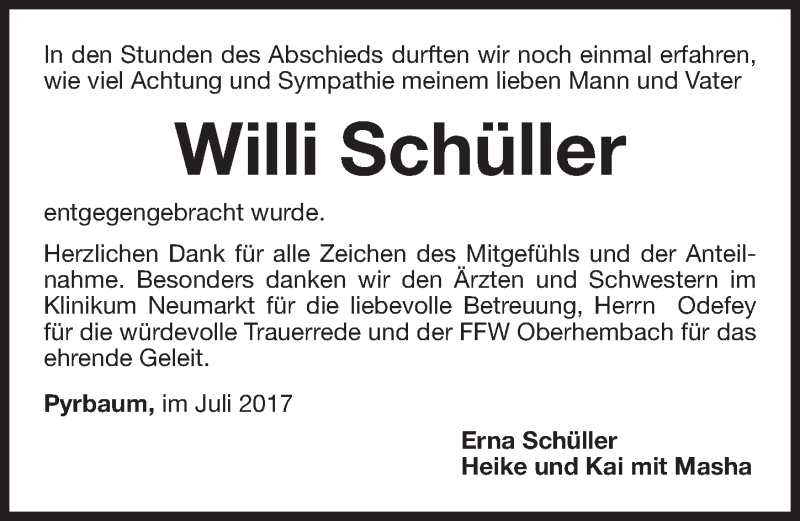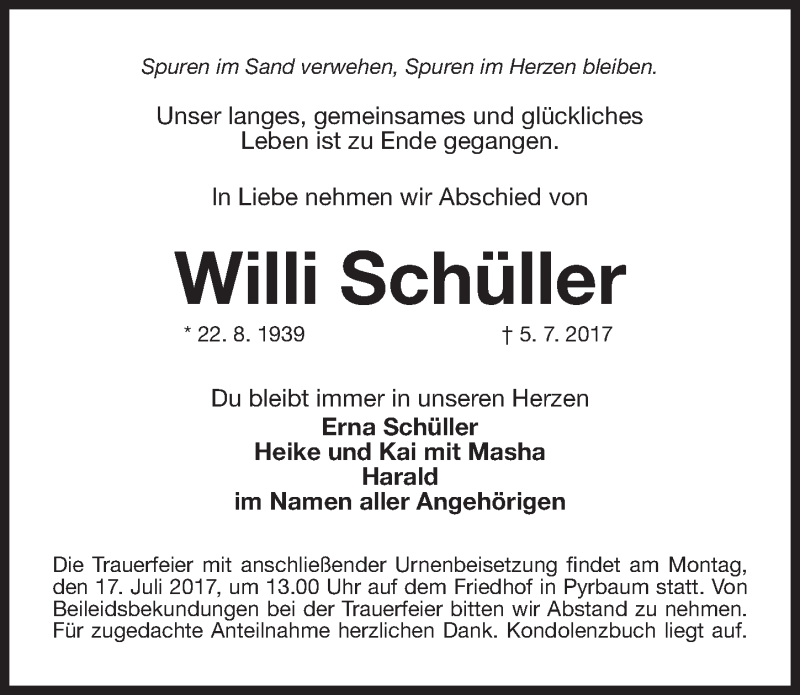 Hier finden Sie alle Traueranzeigen aus der Zeitung, die bisher für Willi Schüller erschienen sind. Weitere Traueranzeigen, die in der Zeitung erscheinen, werden hier ebenfalls aufgelistet