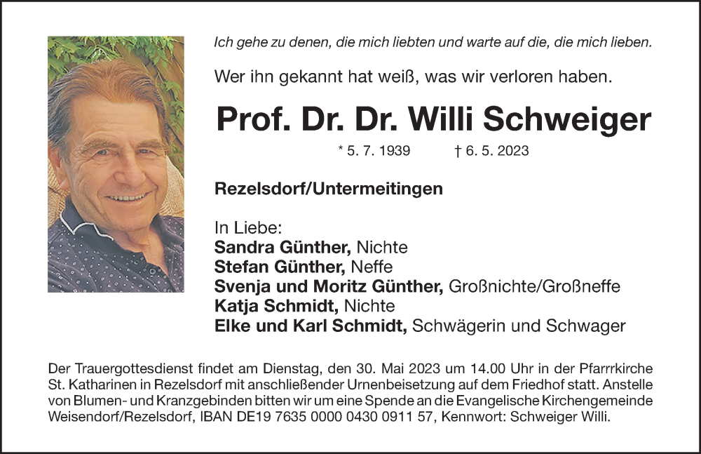 Hier finden Sie alle Traueranzeigen aus der Zeitung, die bisher für Willi Schweiger erschienen sind. Weitere Traueranzeigen, die in der Zeitung erscheinen, werden hier ebenfalls aufgelistet