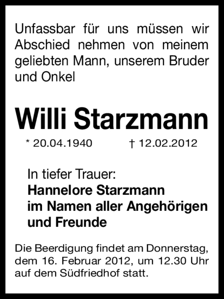Hier finden Sie alle Traueranzeigen aus der Zeitung, die bisher für Willi Starzmann erschienen sind. Weitere Traueranzeigen, die in der Zeitung erscheinen, werden hier ebenfalls aufgelistet