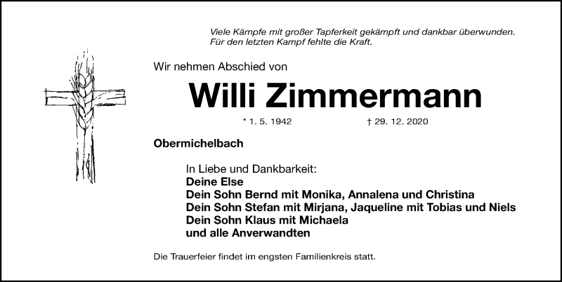 Hier finden Sie alle Traueranzeigen aus der Zeitung, die bisher für Willi Zimmermann erschienen sind. Weitere Traueranzeigen, die in der Zeitung erscheinen, werden hier ebenfalls aufgelistet