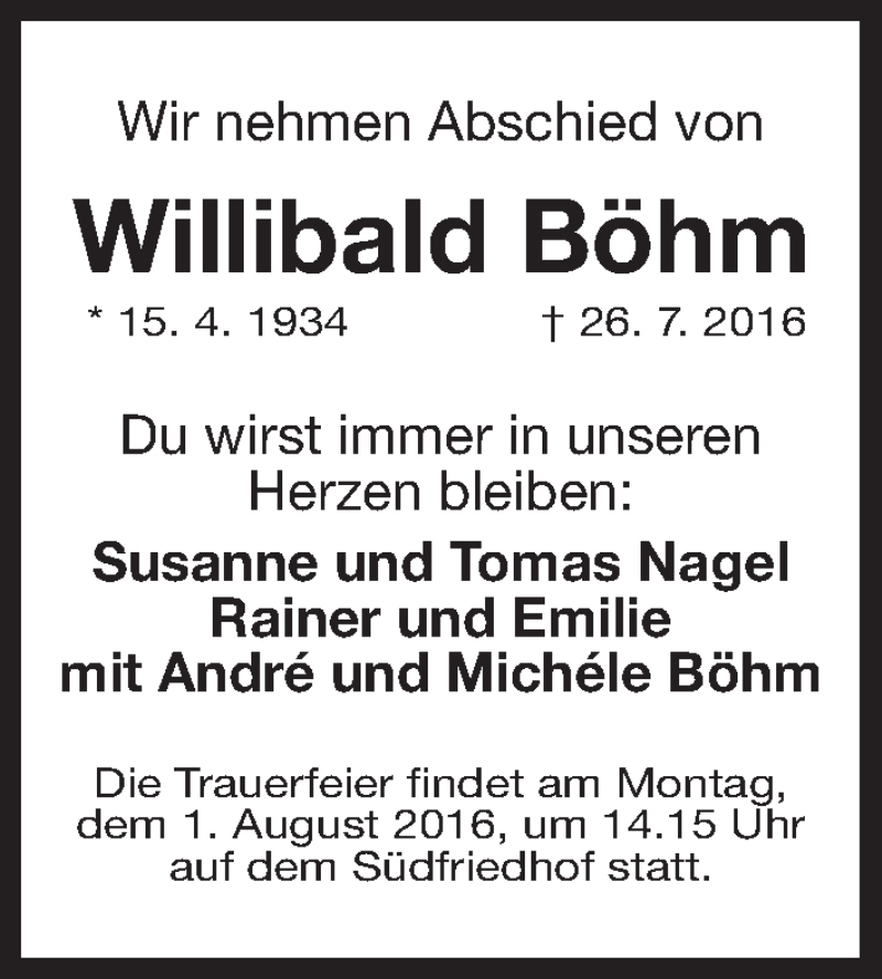 Hier finden Sie alle Traueranzeigen aus der Zeitung, die bisher für Willibald Böhm erschienen sind. Weitere Traueranzeigen, die in der Zeitung erscheinen, werden hier ebenfalls aufgelistet