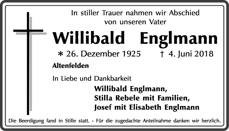 Hier finden Sie alle Traueranzeigen aus der Zeitung, die bisher für Willibald Englmann erschienen sind. Weitere Traueranzeigen, die in der Zeitung erscheinen, werden hier ebenfalls aufgelistet