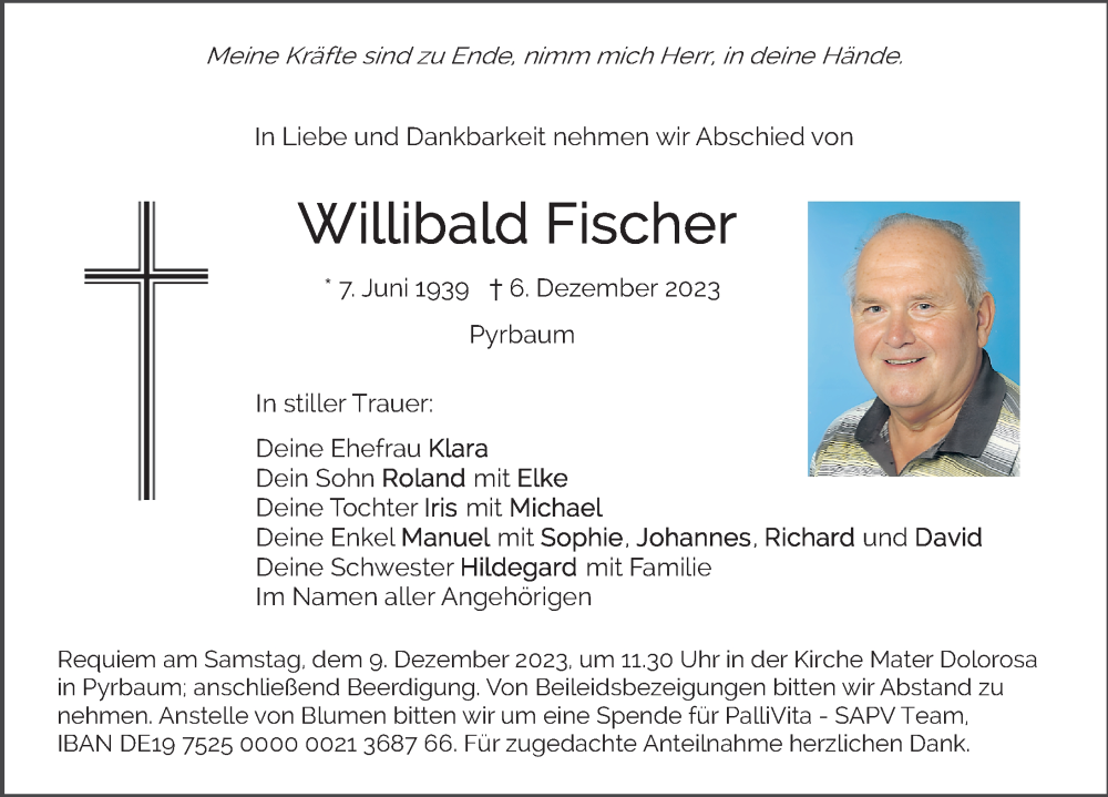 Hier finden Sie alle Traueranzeigen aus der Zeitung, die bisher für Willibald Fischer erschienen sind. Weitere Traueranzeigen, die in der Zeitung erscheinen, werden hier ebenfalls aufgelistet