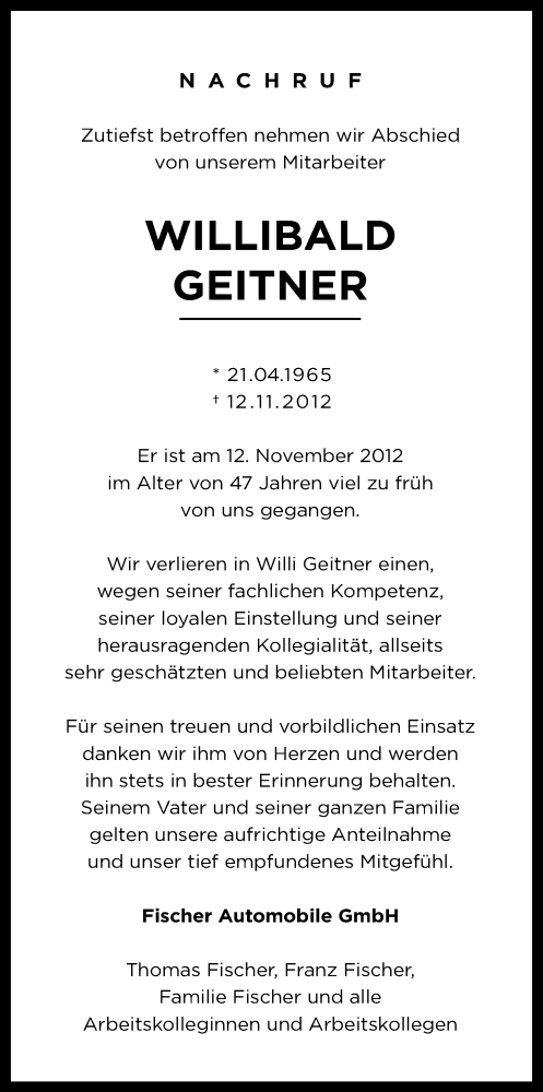 Hier finden Sie alle Traueranzeigen aus der Zeitung, die bisher für Willibald Geitner erschienen sind. Weitere Traueranzeigen, die in der Zeitung erscheinen, werden hier ebenfalls aufgelistet