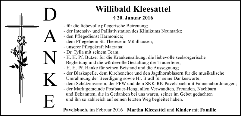 Hier finden Sie alle Traueranzeigen aus der Zeitung, die bisher für Willibald Kleesattel erschienen sind. Weitere Traueranzeigen, die in der Zeitung erscheinen, werden hier ebenfalls aufgelistet