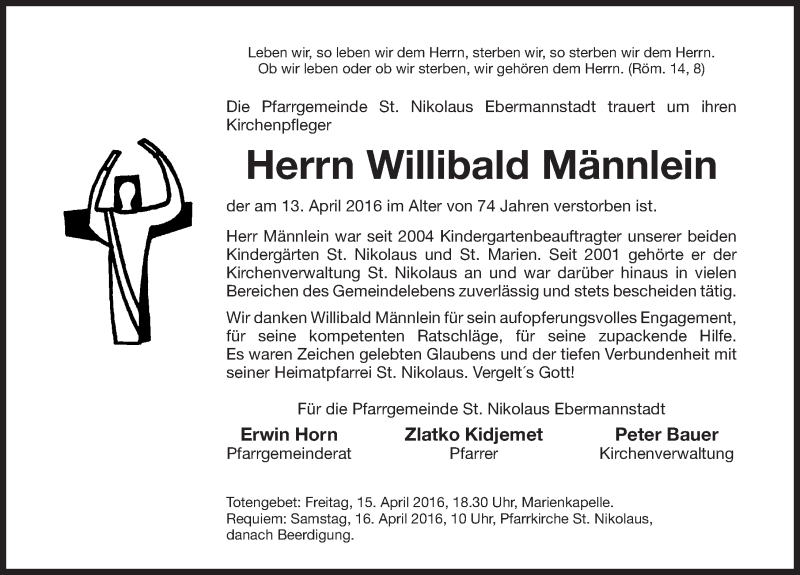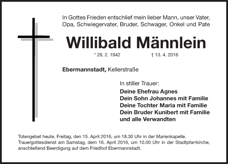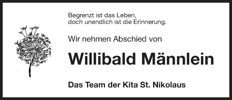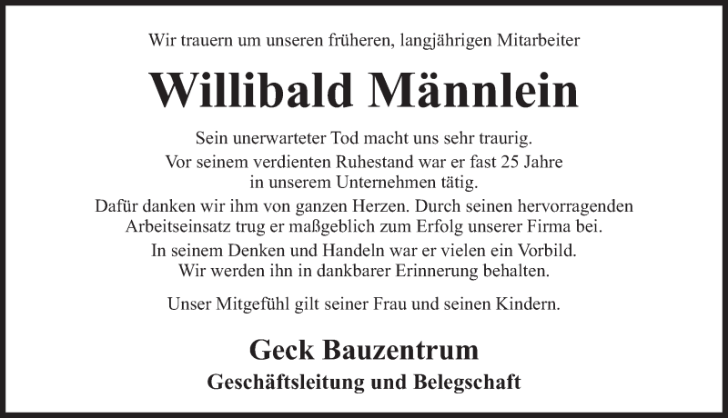 Hier finden Sie alle Traueranzeigen aus der Zeitung, die bisher für Willibald Männlein erschienen sind. Weitere Traueranzeigen, die in der Zeitung erscheinen, werden hier ebenfalls aufgelistet