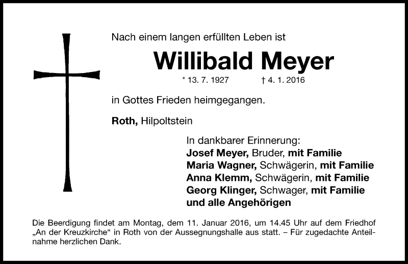 Hier finden Sie alle Traueranzeigen aus der Zeitung, die bisher für Willibald Meyer erschienen sind. Weitere Traueranzeigen, die in der Zeitung erscheinen, werden hier ebenfalls aufgelistet