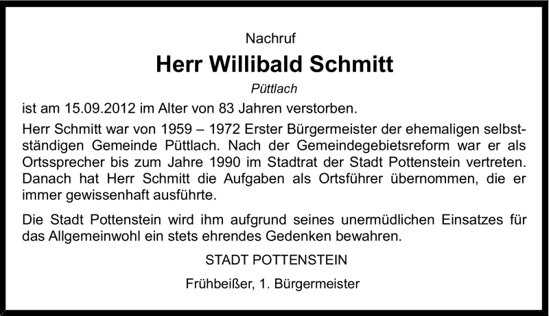 Hier finden Sie alle Traueranzeigen aus der Zeitung, die bisher für Willibald Schmitt erschienen sind. Weitere Traueranzeigen, die in der Zeitung erscheinen, werden hier ebenfalls aufgelistet