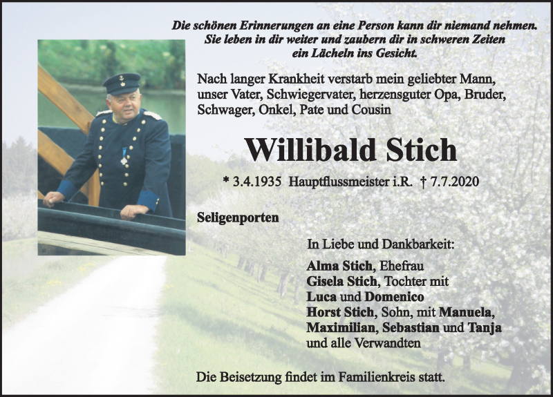 Hier finden Sie alle Traueranzeigen aus der Zeitung, die bisher für Willibald Stich erschienen sind. Weitere Traueranzeigen, die in der Zeitung erscheinen, werden hier ebenfalls aufgelistet