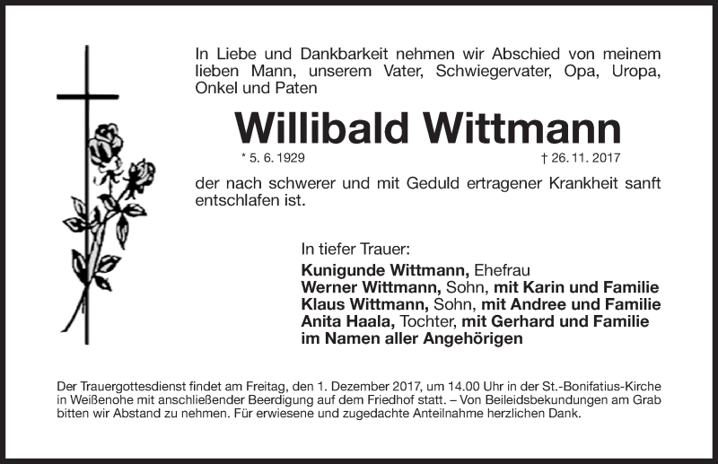 Hier finden Sie alle Traueranzeigen aus der Zeitung, die bisher für Willibald Wittmann erschienen sind. Weitere Traueranzeigen, die in der Zeitung erscheinen, werden hier ebenfalls aufgelistet