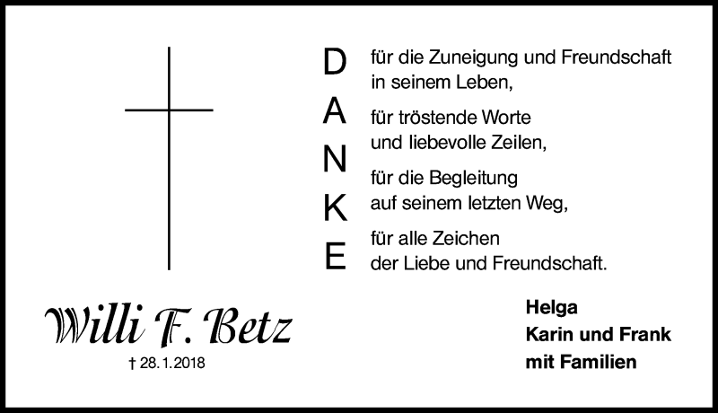 Hier finden Sie alle Traueranzeigen aus der Zeitung, die bisher für Willi F. Betz erschienen sind. Weitere Traueranzeigen, die in der Zeitung erscheinen, werden hier ebenfalls aufgelistet
