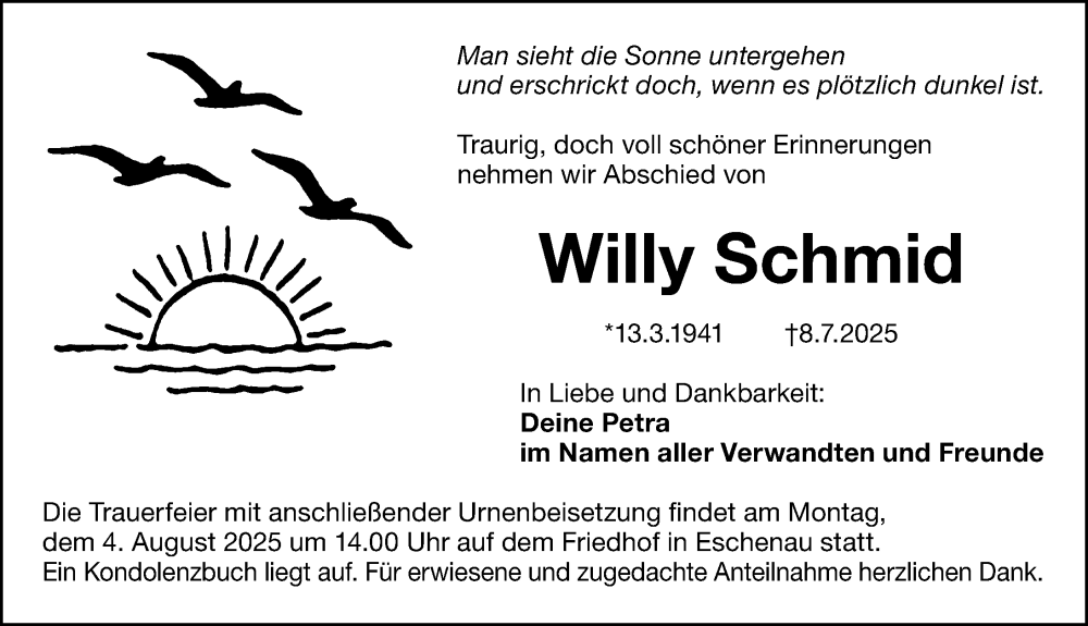 Hier finden Sie alle Traueranzeigen aus der Zeitung, die bisher für Willy Schmid erschienen sind. Weitere Traueranzeigen, die in der Zeitung erscheinen, werden hier ebenfalls aufgelistet