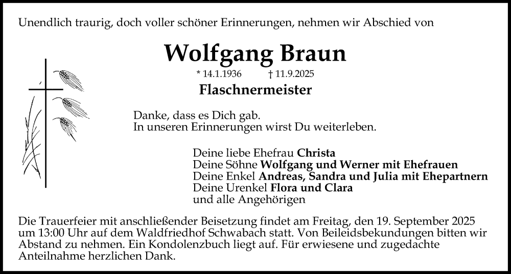 Hier finden Sie alle Traueranzeigen aus der Zeitung, die bisher für Wolfgang Braun erschienen sind. Weitere Traueranzeigen, die in der Zeitung erscheinen, werden hier ebenfalls aufgelistet