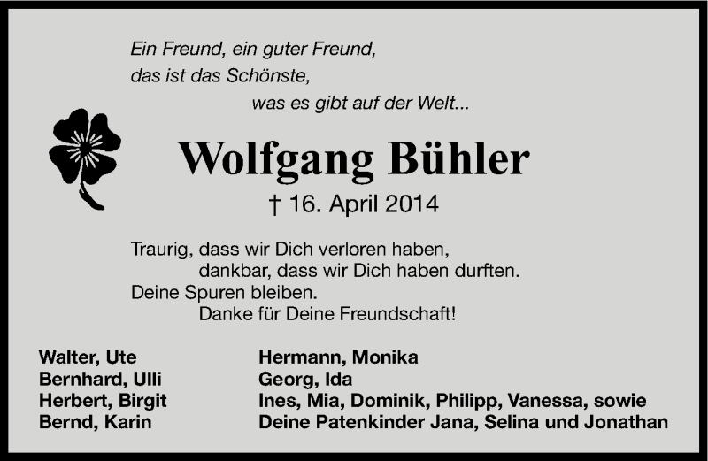 Hier finden Sie alle Traueranzeigen aus der Zeitung, die bisher für Wolfgang Bühler erschienen sind. Weitere Traueranzeigen, die in der Zeitung erscheinen, werden hier ebenfalls aufgelistet