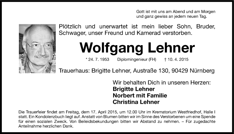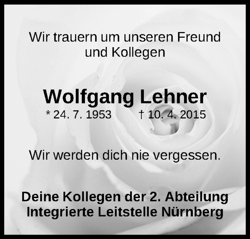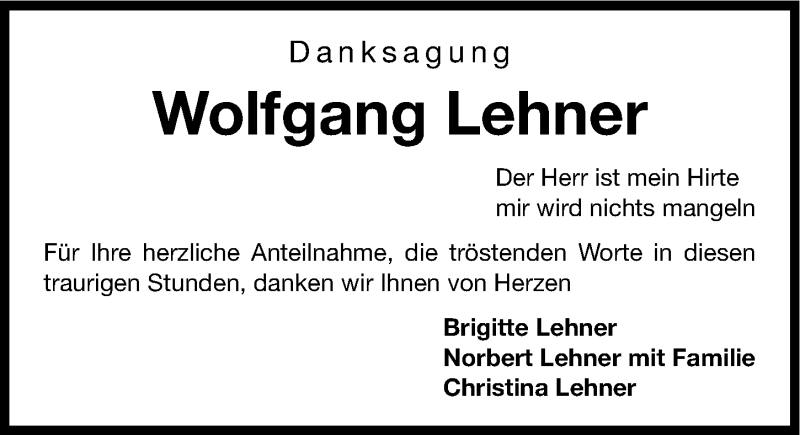 Hier finden Sie alle Traueranzeigen aus der Zeitung, die bisher für Wolfgang Lehner erschienen sind. Weitere Traueranzeigen, die in der Zeitung erscheinen, werden hier ebenfalls aufgelistet