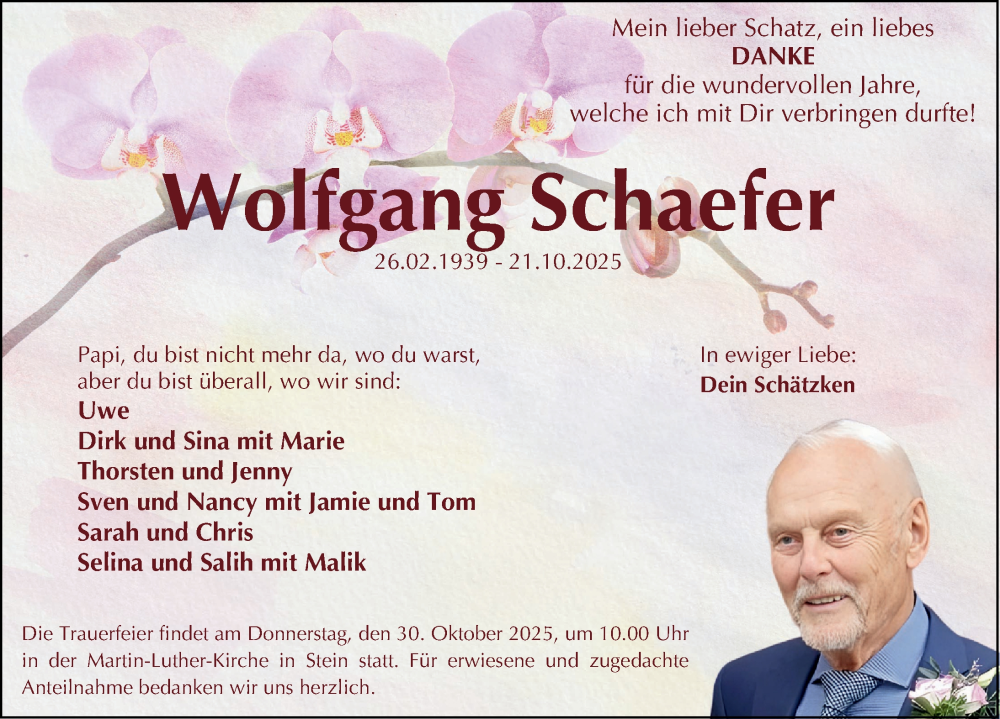 Hier finden Sie alle Traueranzeigen aus der Zeitung, die bisher für Wolfgang Schaefer erschienen sind. Weitere Traueranzeigen, die in der Zeitung erscheinen, werden hier ebenfalls aufgelistet