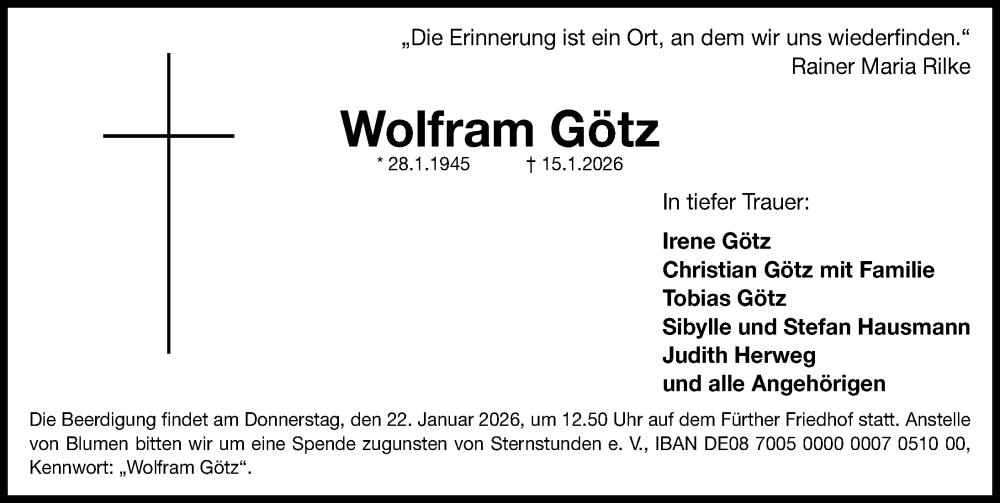 Hier finden Sie alle Traueranzeigen aus der Zeitung, die bisher für Wolfram Götz erschienen sind. Weitere Traueranzeigen, die in der Zeitung erscheinen, werden hier ebenfalls aufgelistet