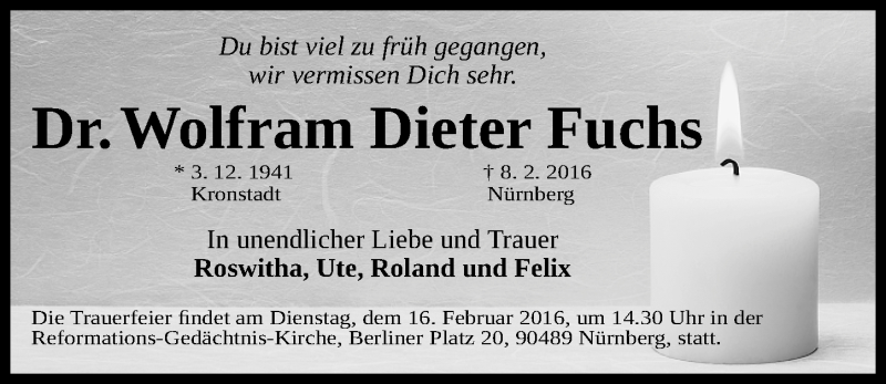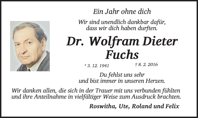 Hier finden Sie alle Traueranzeigen aus der Zeitung, die bisher für Wolfram Dieter Fuchs erschienen sind. Weitere Traueranzeigen, die in der Zeitung erscheinen, werden hier ebenfalls aufgelistet