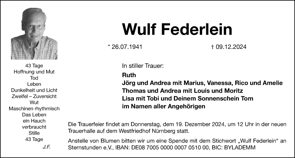 Hier finden Sie alle Traueranzeigen aus der Zeitung, die bisher für Wulf Federlein erschienen sind. Weitere Traueranzeigen, die in der Zeitung erscheinen, werden hier ebenfalls aufgelistet
