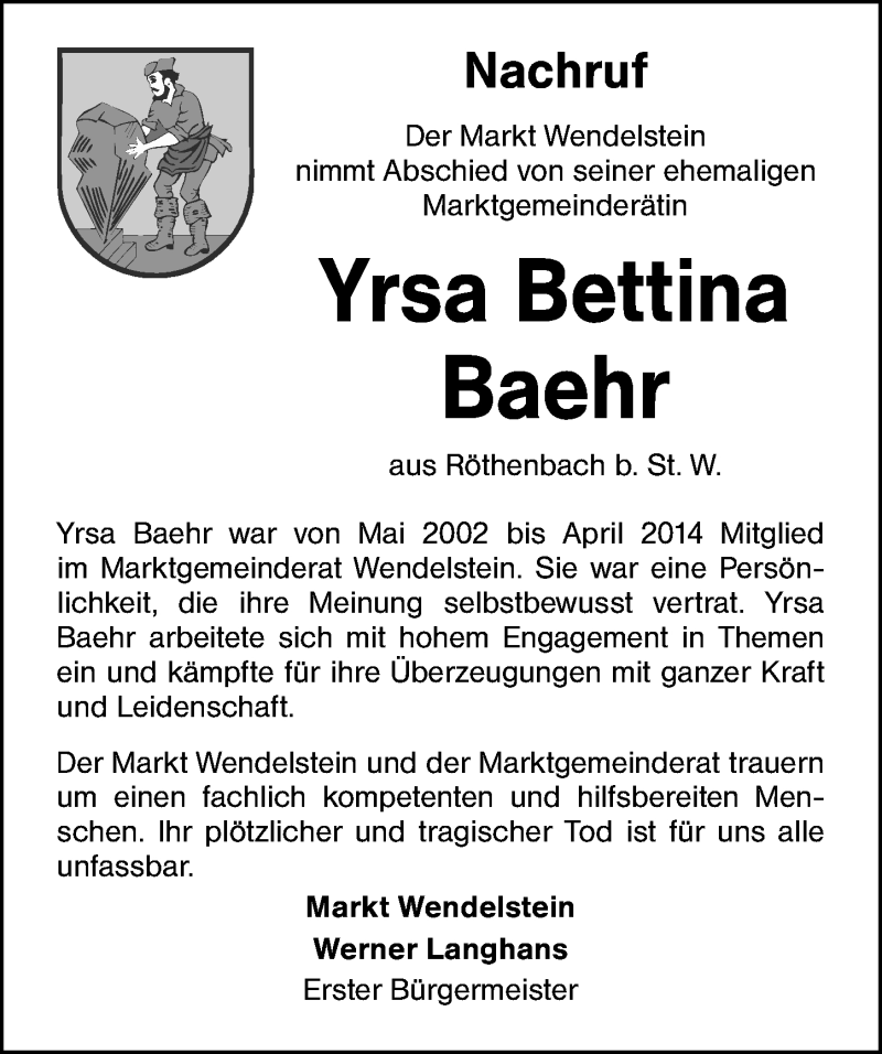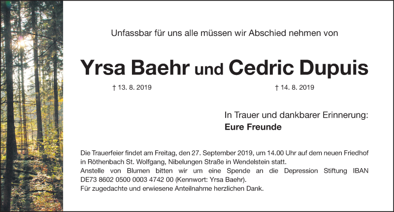 Hier finden Sie alle Traueranzeigen aus der Zeitung, die bisher für Yrsa Baehr und Cedric Dupuis erschienen sind. Weitere Traueranzeigen, die in der Zeitung erscheinen, werden hier ebenfalls aufgelistet